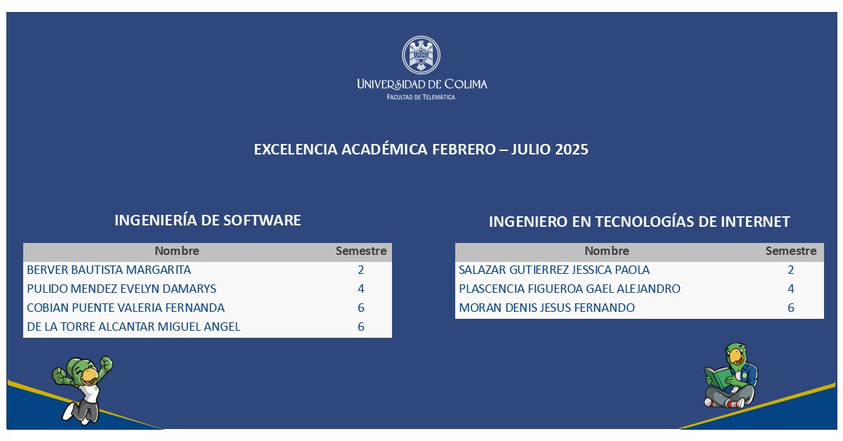 La comunidad de la Facultad de Telemática extiende una emotiva felicitación a nuestros estudiantes de Ingeniería de Software e Ingeniería en Tecnologías de Internet, que por haber obtenido el promedio más alto, son merecedores de la excelencia académica. Reconocemos su esfuerzo y dedicación al estudio.